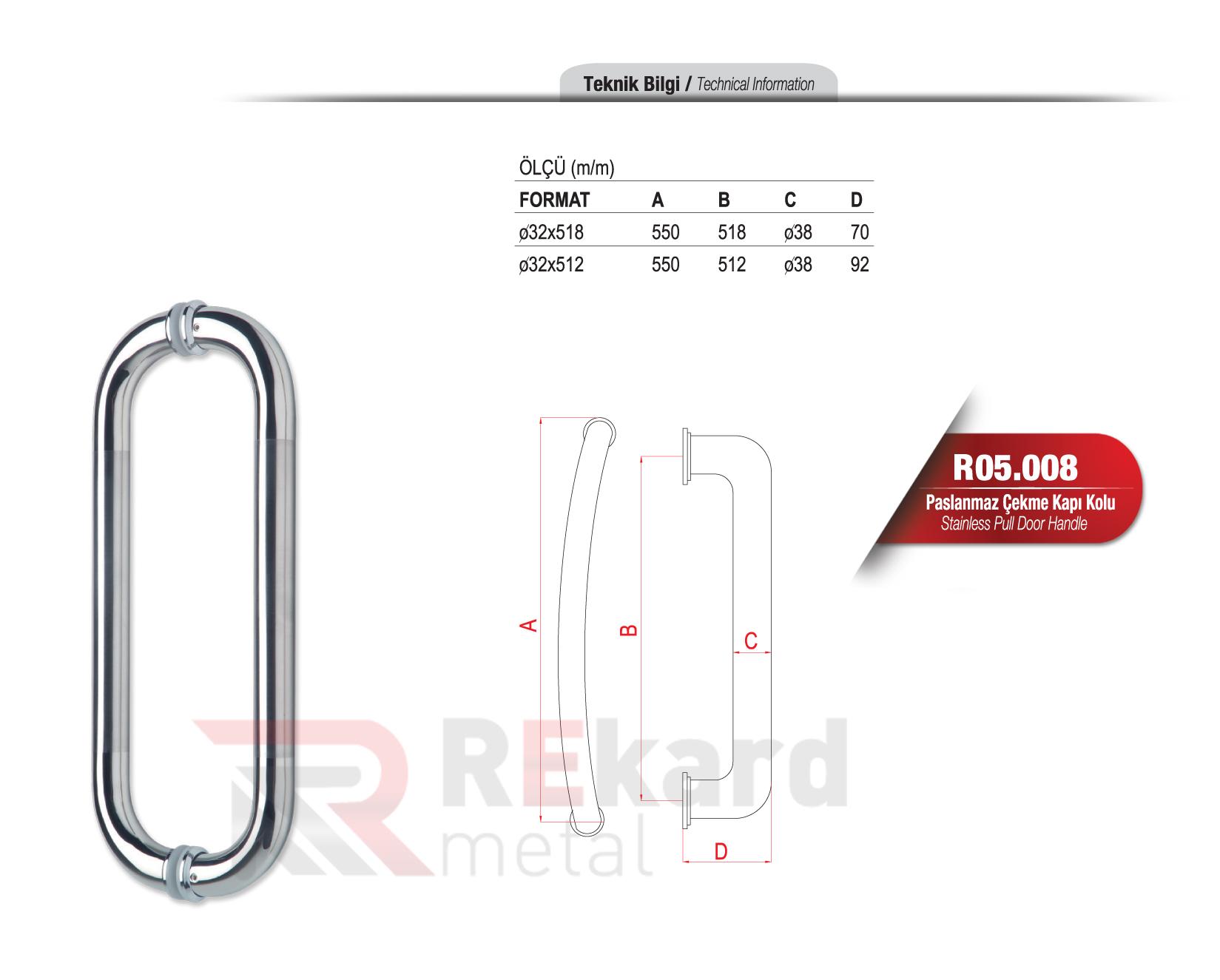 Rekard Metal bünyesinde R05.008 Paslanmaz Çekme Kapı Kolu adlı ürünü bulabilirsiniz. Rekard Metal R05.008 Paslanmaz Çekme Kapı Kolu ve daha birçok ürün çeşidi ile siz değerli müşterilerimize hizmet vermektedir. Rekard Metal sektöründe 20 yıllık bir deneyimle bilgisini ve varlığını alüminyum ürünler üzerine kurmuş, alüminyum profil ve sistemleri ile alüminyum aksesuar tedarikinde dünya markaların ürünlerini ihraç eden bir alüminyum şirketidir. Firmamız endüstriyel anlamda inşaat ve yapı sektörüne alüminyum profil ve aksesuar ürünlerinin satışını yaparak faaliyetlerine devam etmektedir.