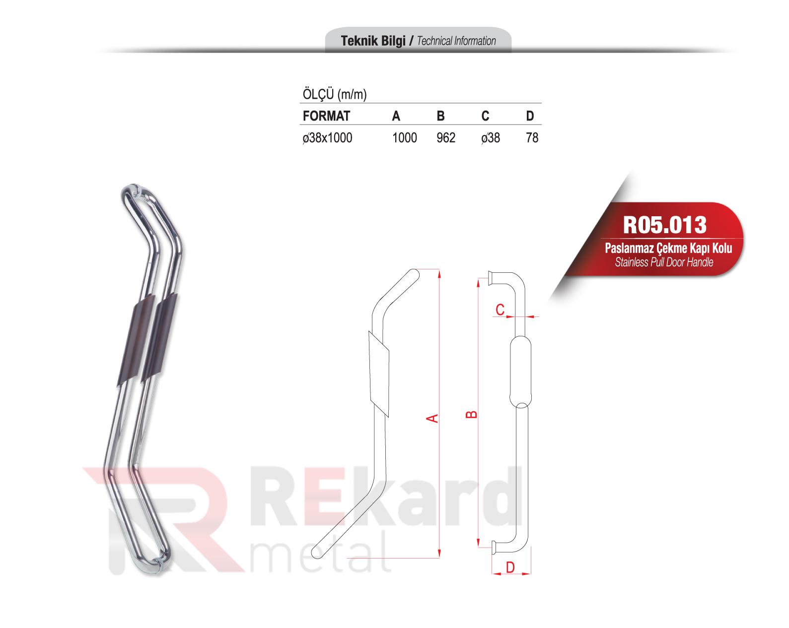 Rekard Metal bünyesinde R05.013 Paslanmaz Çekme Kapı Kolu adlı ürünü bulabilirsiniz. Rekard Metal R05.013 Paslanmaz Çekme Kapı Kolu ve daha birçok ürün çeşidi ile siz değerli müşterilerimize hizmet vermektedir. Rekard Metal sektöründe 20 yıllık bir deneyimle bilgisini ve varlığını alüminyum ürünler üzerine kurmuş, alüminyum profil ve sistemleri ile alüminyum aksesuar tedarikinde dünya markaların ürünlerini ihraç eden bir alüminyum şirketidir. Firmamız endüstriyel anlamda inşaat ve yapı sektörüne alüminyum profil ve aksesuar ürünlerinin satışını yaparak faaliyetlerine devam etmektedir.