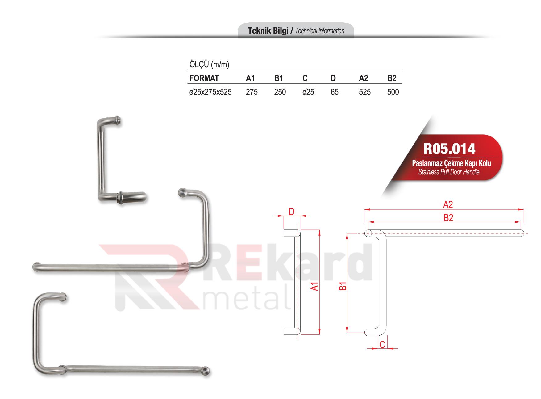 Rekard Metal bünyesinde R05.014 Paslanmaz Çelik Kapı Kolu adlı ürünü bulabilirsiniz. Rekard Metal R05.014 Paslanmaz Çelik Kapı Kolu ve daha birçok ürün çeşidi ile siz değerli müşterilerimize hizmet vermektedir. Rekard Metal sektöründe 20 yıllık bir deneyimle bilgisini ve varlığını alüminyum ürünler üzerine kurmuş, alüminyum profil ve sistemleri ile alüminyum aksesuar tedarikinde dünya markaların ürünlerini ihraç eden bir alüminyum şirketidir. Firmamız endüstriyel anlamda inşaat ve yapı sektörüne alüminyum profil ve aksesuar ürünlerinin satışını yaparak faaliyetlerine devam etmektedir.