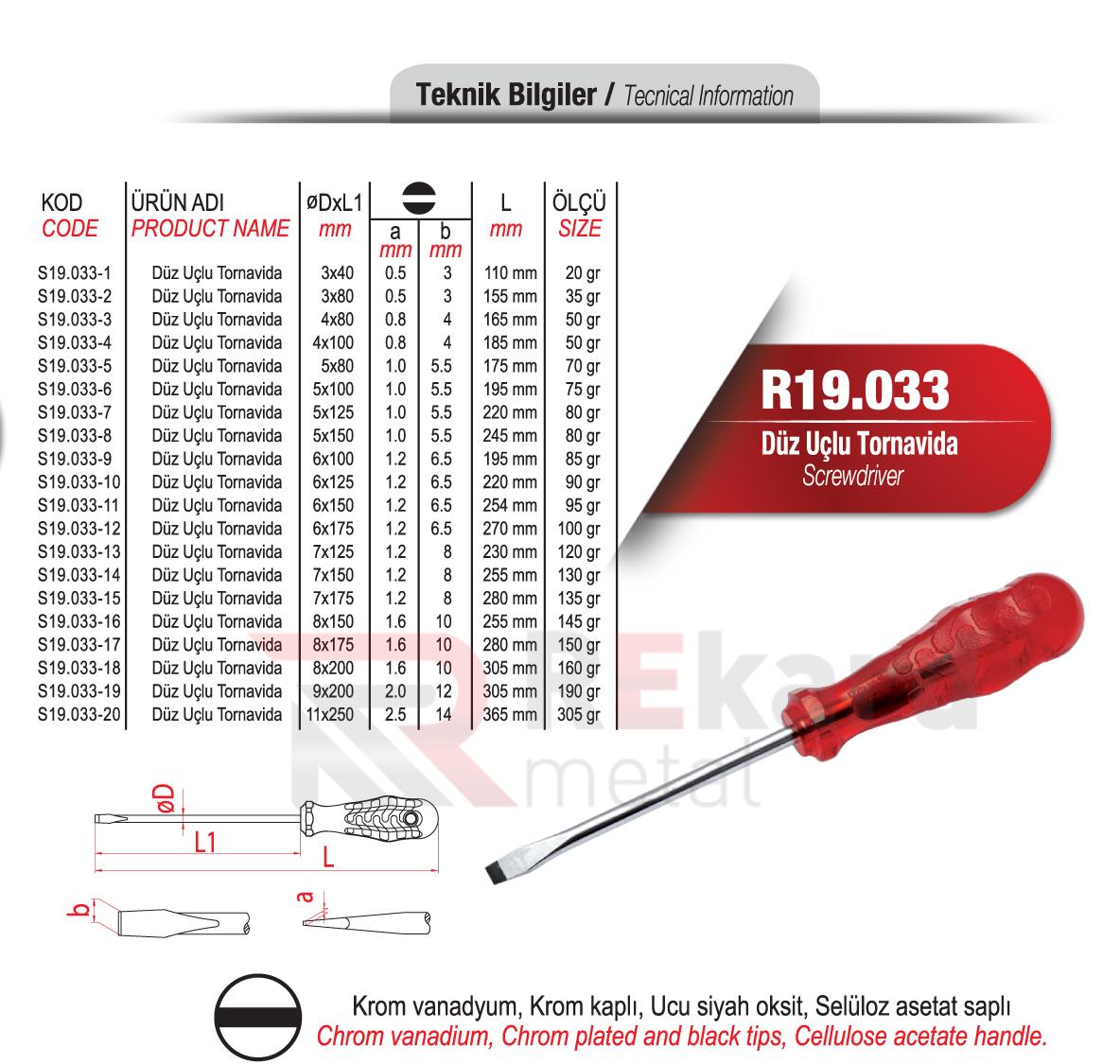Rekard Metal bünyesinde R19.033 Düz Uçlu Tornavida adlı ürünü bulabilirsiniz. Rekard Metal R19.033 Düz Uçlu Tornavida ve daha birçok ürün çeşidi ile siz değerli müşterilerimize hizmet vermektedir. Rekard Metal sektöründe 20 yıllık bir deneyimle bilgisini ve varlığını alüminyum ürünler üzerine kurmuş, alüminyum profil ve sistemleri ile alüminyum aksesuar tedarikinde dünya markaların ürünlerini ihraç eden bir alüminyum şirketidir. Firmamız endüstriyel anlamda inşaat ve yapı sektörüne alüminyum profil ve aksesuar ürünlerinin satışını yaparak faaliyetlerine devam etmektedir.