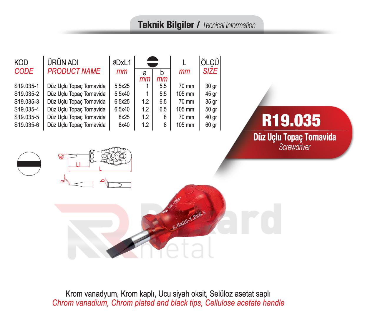 Rekard Metal bünyesinde R19.035 Düz UUçlu Topaç Tornavida adlı ürünü bulabilirsiniz. Rekard Metal R19.035 Düz UUçlu Topaç Tornavida ve daha birçok ürün çeşidi ile siz değerli müşterilerimize hizmet vermektedir. Rekard Metal sektöründe 20 yıllık bir deneyimle bilgisini ve varlığını alüminyum ürünler üzerine kurmuş, alüminyum profil ve sistemleri ile alüminyum aksesuar tedarikinde dünya markaların ürünlerini ihraç eden bir alüminyum şirketidir. Firmamız endüstriyel anlamda inşaat ve yapı sektörüne alüminyum profil ve aksesuar ürünlerinin satışını yaparak faaliyetlerine devam etmektedir.
